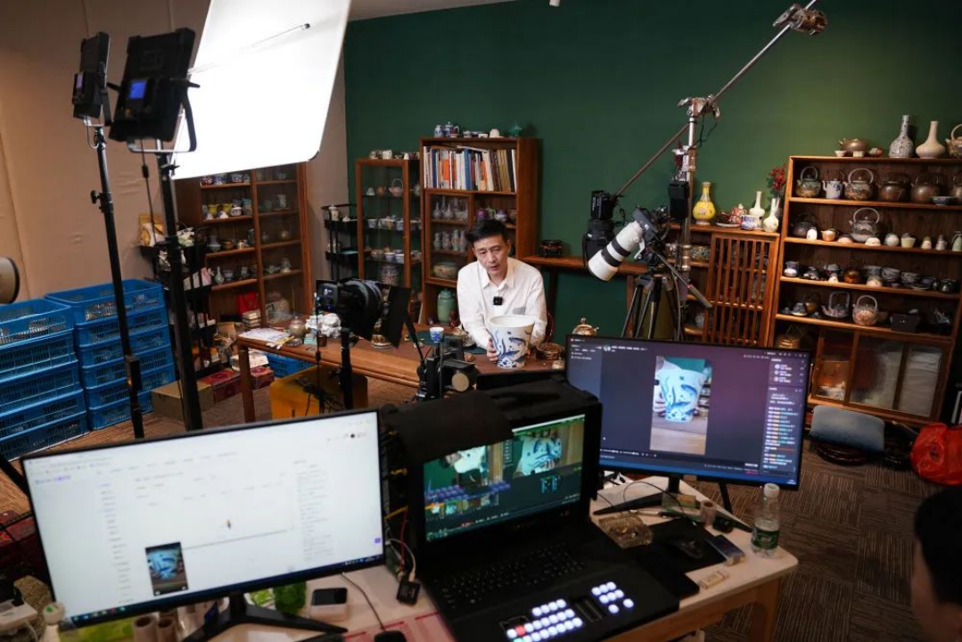 在江西景德鎮陶溪川文創(chuàng )街區的直播基地里,工作人員通過(guò)網(wǎng)絡(luò )直播推介陶瓷產(chǎn)品(2023年2月22日攝)。新華社記者周密攝