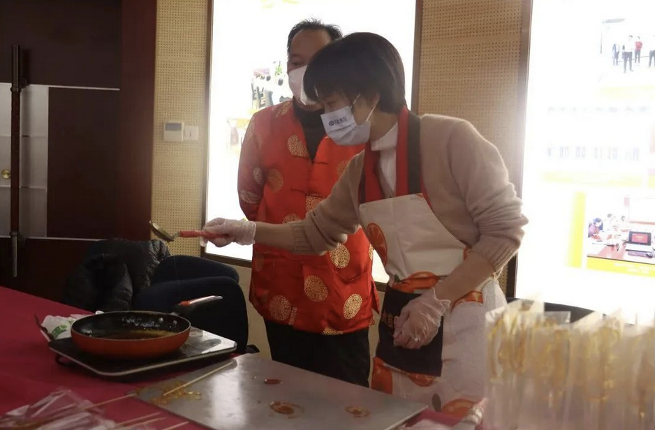 為了讓大家在游園過(guò)程中也能體驗一把“攤主”的樂(lè )趣,五個(gè)攤位分別由公司五個(gè)黨支部“認領(lǐng)”,大家系起圍裙開(kāi)始“攬客”。糖畫(huà)鋪前人聲鼎沸,糖畫(huà)師傅揮動(dòng)著(zhù)糖勺,妙趣橫生的糖畫(huà)繪制使得員工們躍躍欲試;擲著(zhù)“大展宏兔”飛盤(pán)的員工們屏氣蓄力、果斷出手,加油聲、歡呼聲不斷;花燈攤位上的精美燈籠成為人手一個(gè)的游園必備單品;頗具挑戰的猜燈謎吸引大家展開(kāi)頭腦風(fēng)暴,逛園動(dòng)腦兩不誤;湯圓鋪前的搓湯圓制作現場(chǎng)更是熱情高漲,熱氣騰騰的湯圓承載著(zhù)人們的期許,希望新的一年福建金投事業(yè)蒸蒸日上。